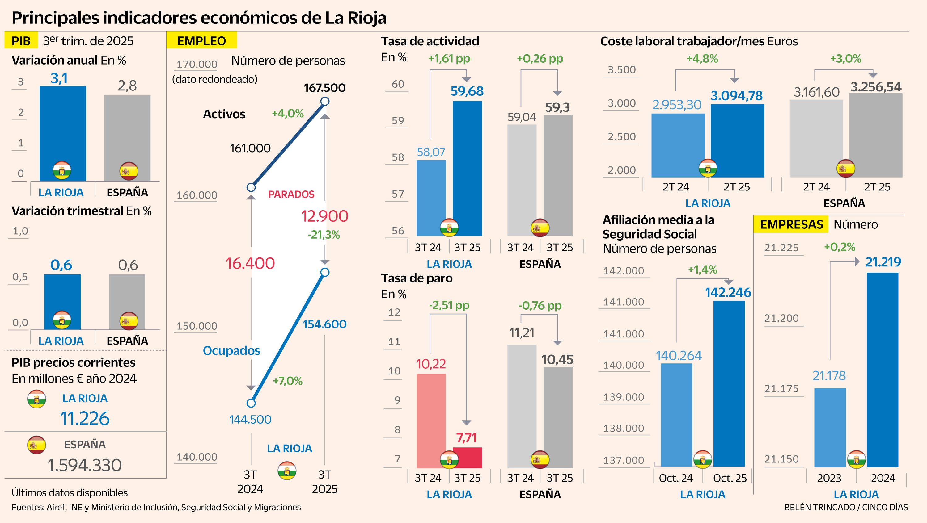 La economía riojana atraviesa un punto de inflexión. Su sector vitivinícola, emblema productivo y cultural, y su tradicional base industrial afrontan el reto de adaptarse al menor consumo y a la desaceleración, mientras la región diversifica su modelo productivo para consolidar el impulso. En este contexto, La Rioja resiste tras registrar un crecimiento del 3,1% en el tercer trimestre de 2025, tres décimas por encima de la media nacional (2,8%), según estimaciones de la Autoridad Independiente de Responsabilidad Fiscal (AIReF).