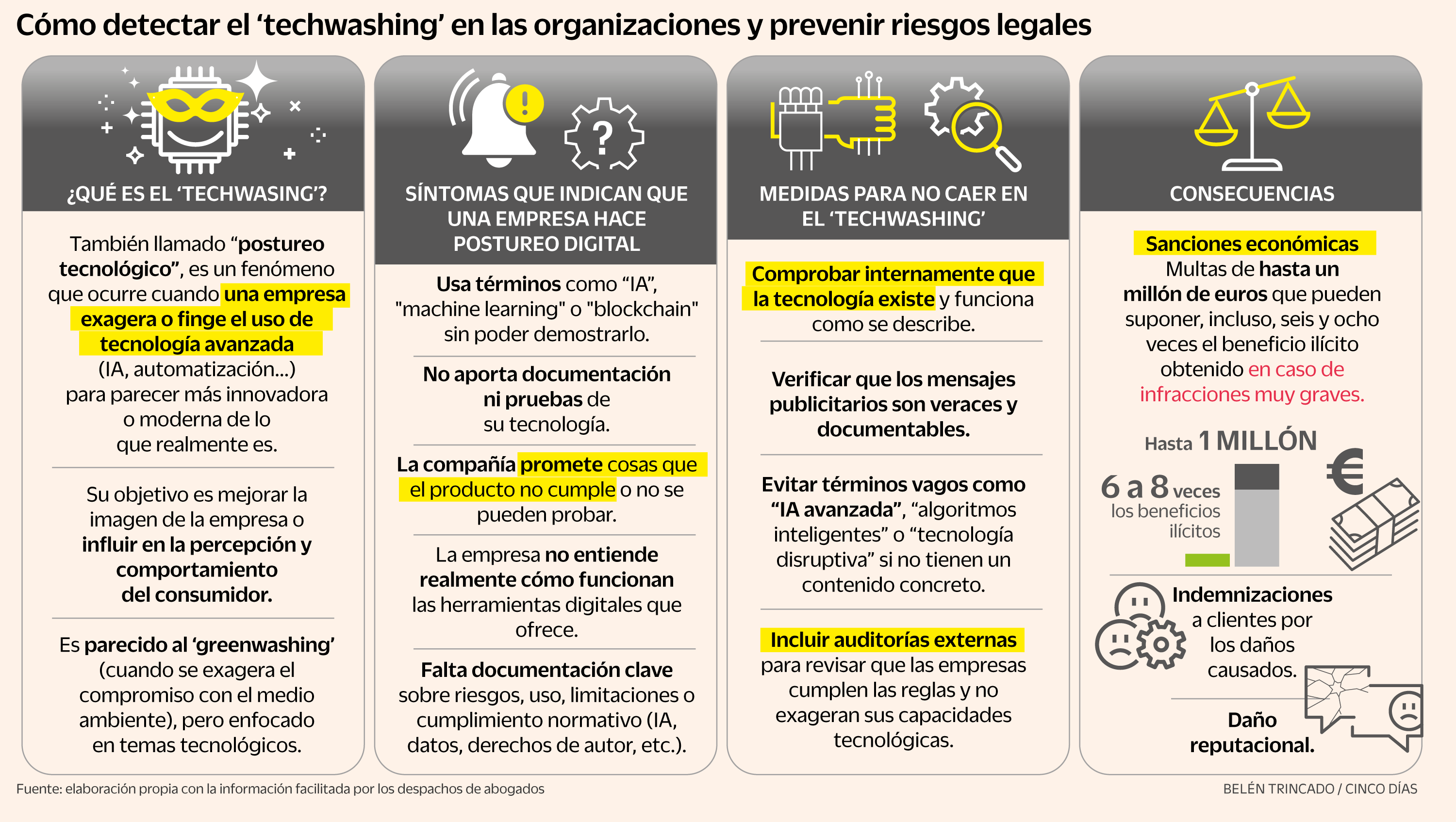La irrupción de la inteligencia artificial (IA) ha revolucionado el tejido empresarial a nivel mundial. En plena era de la transformación digital, las empresas se esfuerzan por incorporar nuevas tecnologías en sus modelos de negocio para ganar eficiencia y optimizar recursos. Sobre todo, buscan no quedarse atrás en un mercado donde la innovación está a la orden del día. Sin embargo, entre la ambición por destacar y la presión por ser más competitivas, algunas organizaciones caen en la trampa de aparentar una imagen de entidad tecnológica más avanzada de la que realmente es. Este fenómeno —también conocido como techwashing—, se ha convertido en una amenaza cada vez más presente.