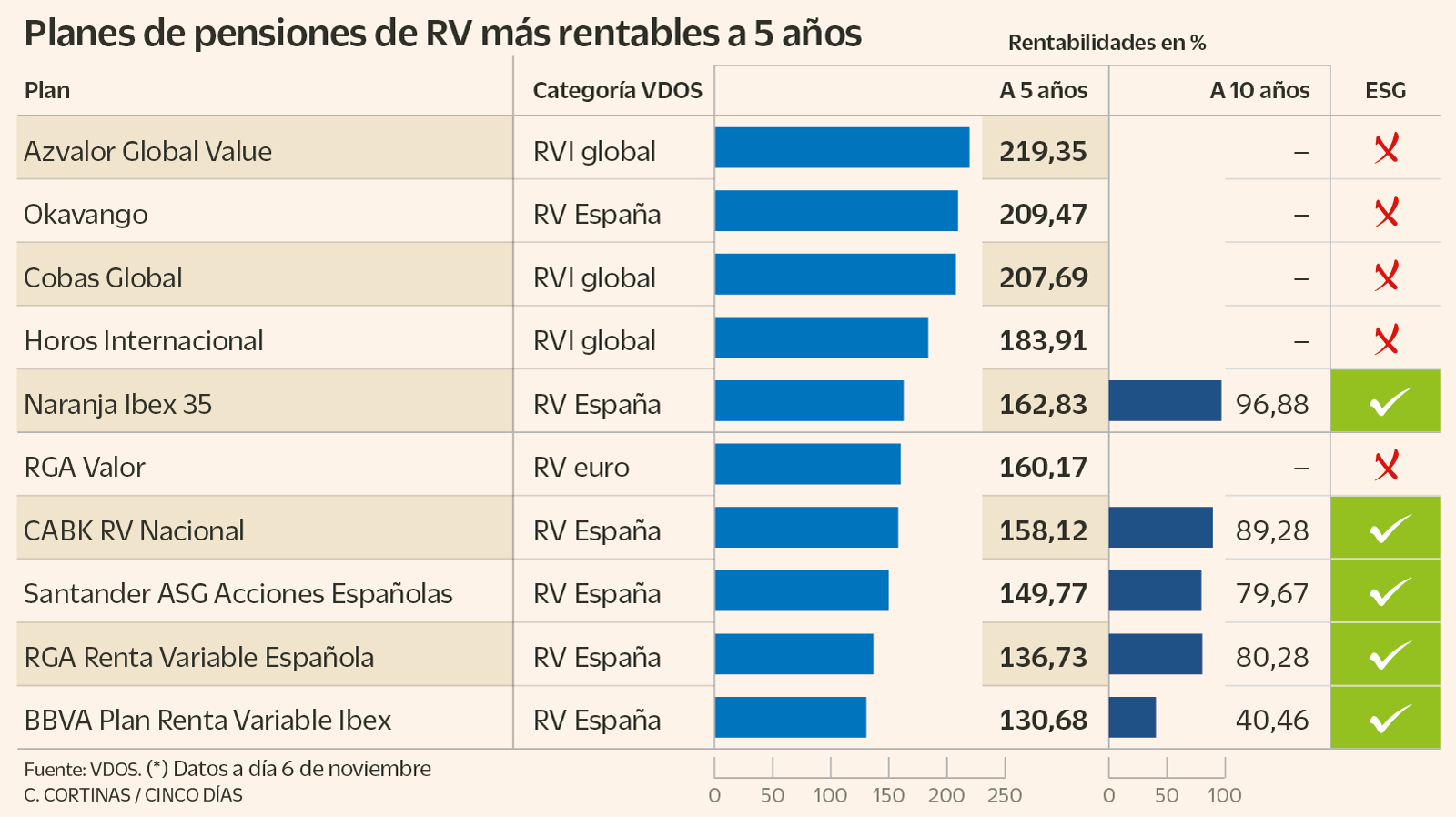 Hay buenas noticias para los ahorradores para la jubilación que busquen, además de rentabilidad, beneficios extra financieros. Según la clasificación de los planes de pensiones individuales más rentables a cinco años, entre los diez primeros se colocan cinco vehículos que tienen en cuenta aspectos ESG, todos ellos de la categoría Renta Variable España. Así lo confirman los datos aportados por VDOS, que detecta que la mitad de los productos tiene en cuenta criterios ambientales, sociales y de gobernanza (ESG en castellano o ESG en inglés), según sus políticas de inversión.