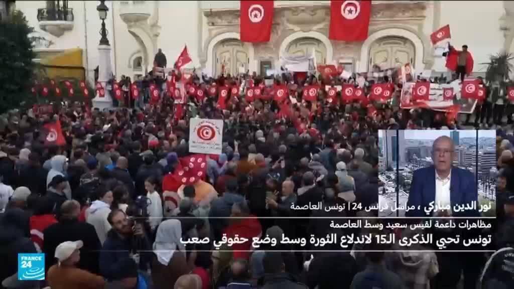 تجمع نحو ألفين من أنصار الرئيس التونسي قيس سعيّد الذي يتهمه معارضوه بالتسلّط، في العاصمة تونس الأربعاء في الذكرى الخامسة عشرة لانطلاق الثورة التي أطاحت بالرئيس زين العابدين بن علي. وكانت انطلقت الشرارارة الأولى للثورة في تونس من مدينة سيدي بوزيد، بعدما قام البائع محمد البوعزيزي بإضرام النار في جسده احتجاجا على ما اعتبره ظلما وتعسفا في 17 كانون الأول/ديسمبر 2010.