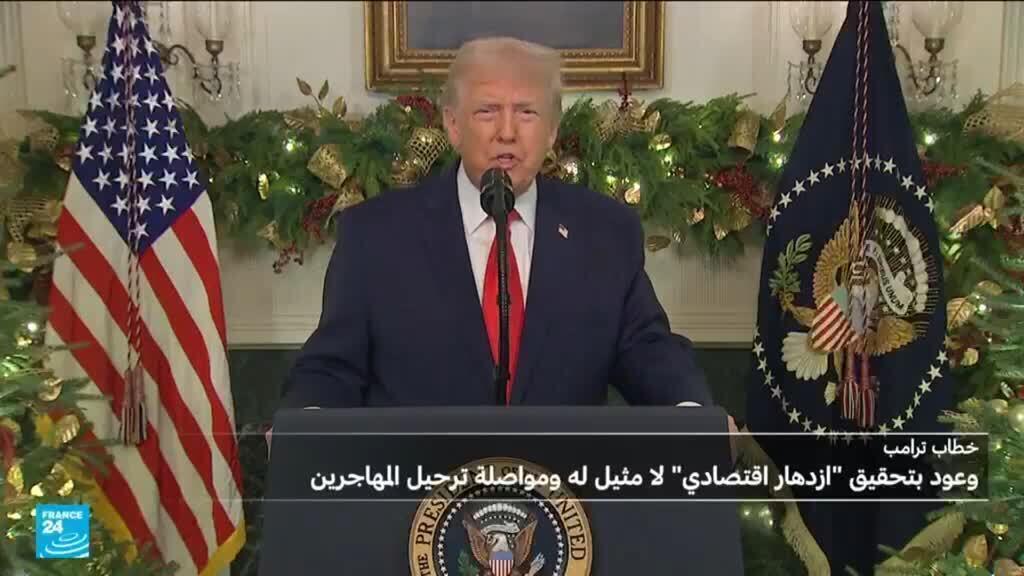 ألقى الرئيس الأمريكي دونالد ترامب الأربعاء خطابا قصيرا لمناسبة نهاية العام أكد فيه مواصلة مساره الاقتصادي ،رغم تزايد السخط الأمريكي تجاهه، فيما انتقد سلفه الديموقراطي جو بايدن وهاجم المهاجرين بعنف.