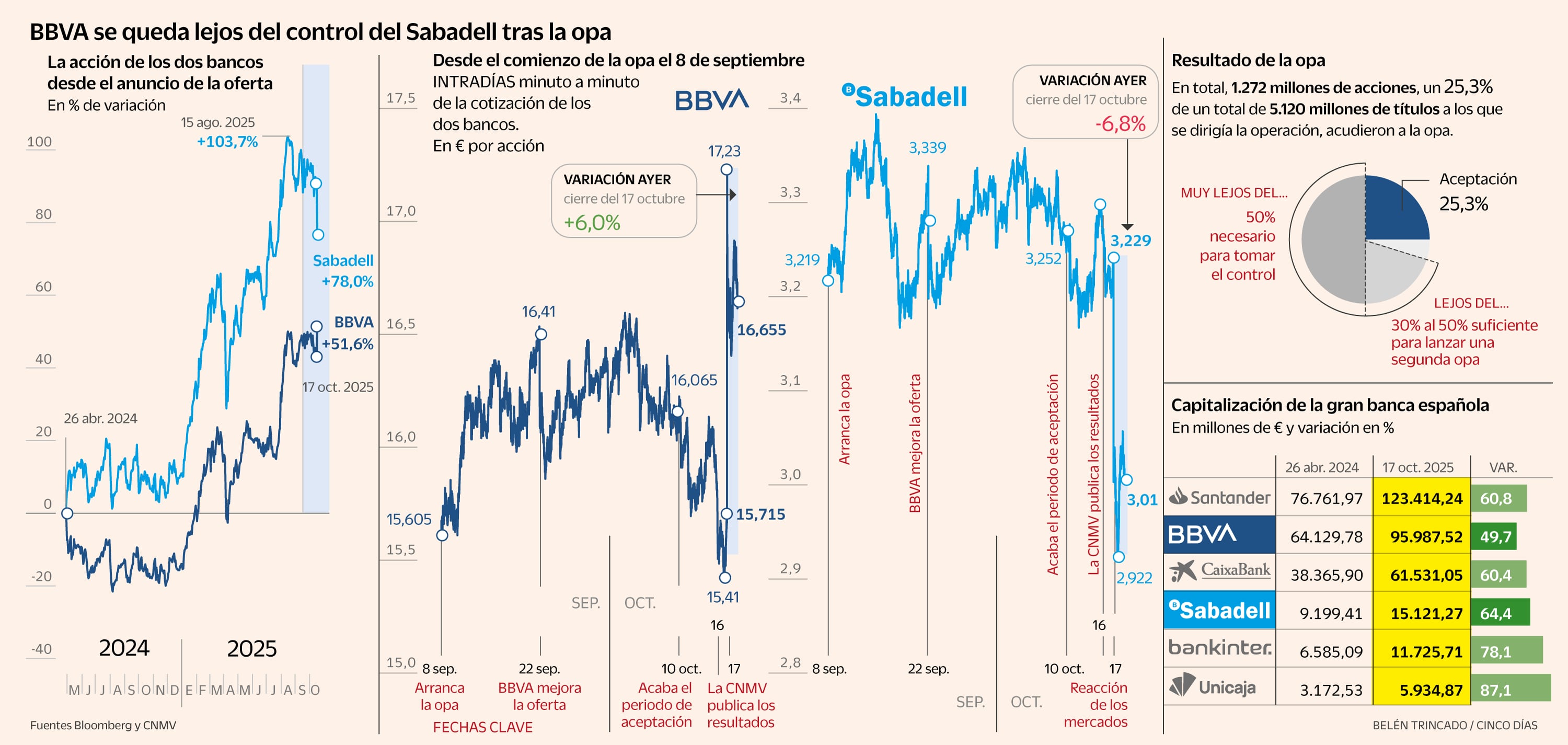 El mercado ha reaccionado con violencia al fracaso de la opa del BBVA sobre el Sabadell, después de que la entidad que preside Carlos Torres se quedara muy lejos de controlar, como pretendía, el 50% de la entidad vallesana: el 25,33% de aceptación dista mucho de sus aspiraciones. Los inversores premiaron el fracaso con una histórica subida para el BBVA, que llegó al 10% (la mayor en cinco años) en los primeros compases de la sesión. La entidad de origen vasco no subía tanto desde hace casi cinco años. Al cierre, la revalorización se situó en el 5,98%, lo que lleva a la acción a revalidar su nivel más alto desde 2007. En paralelo, las acciones del Sabadell han caído con fuerza, un 6,78%. Durante 17 meses, las cotizaciones de ambos bancos se han movido en paralelo, ajustando las expectativas sobre precio, éxito de la oferta, dividendos o posibles mejoras. Una vez ha decaído la opa, cada entidad reinicia su camino independiente.