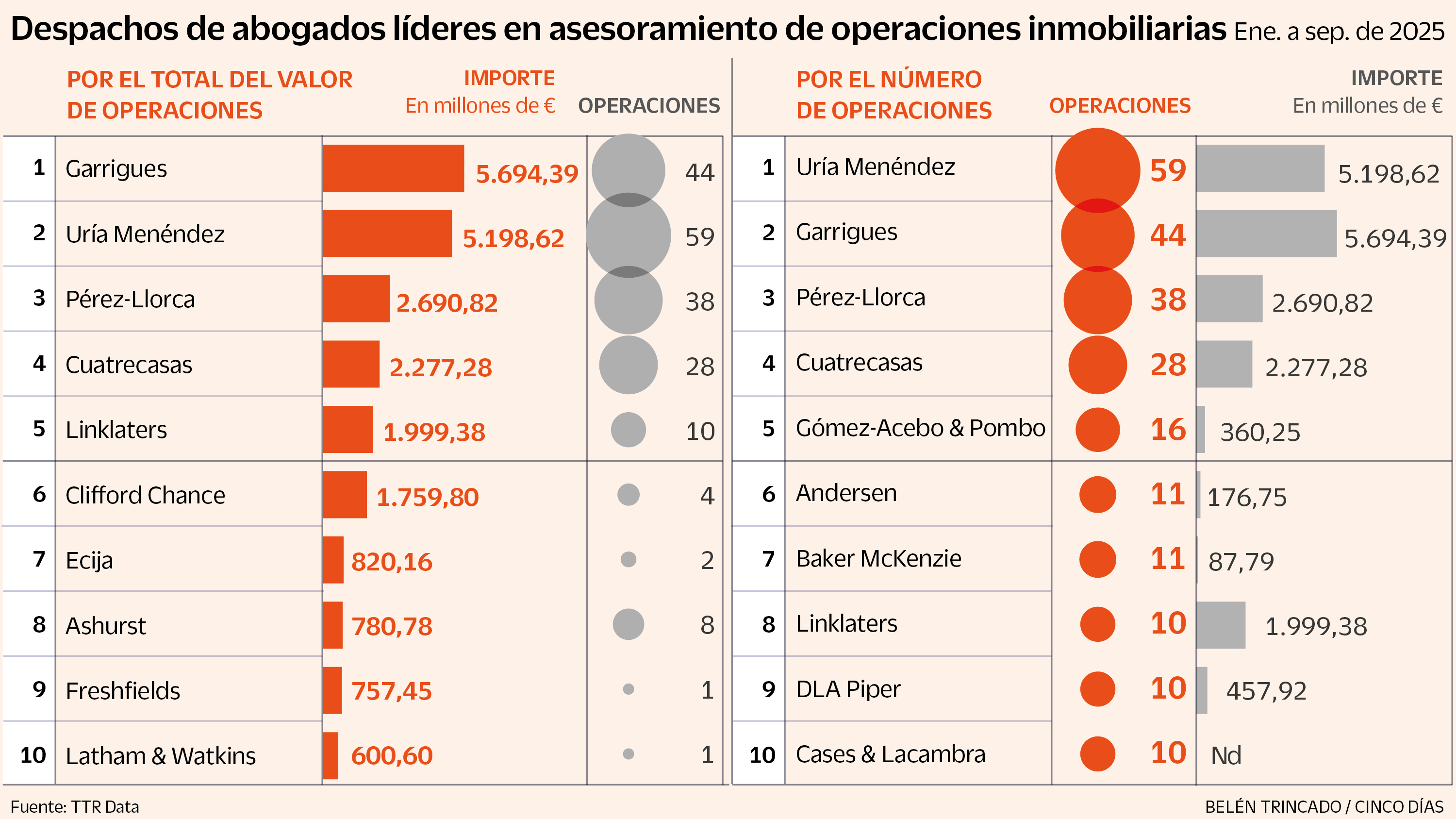 Garrigues y Uría Menéndez se reparten el liderazgo del M&A inmobiliario; Pérez-Llorca sube al podio